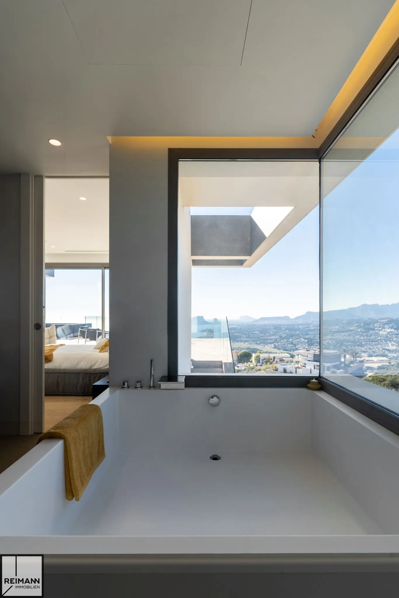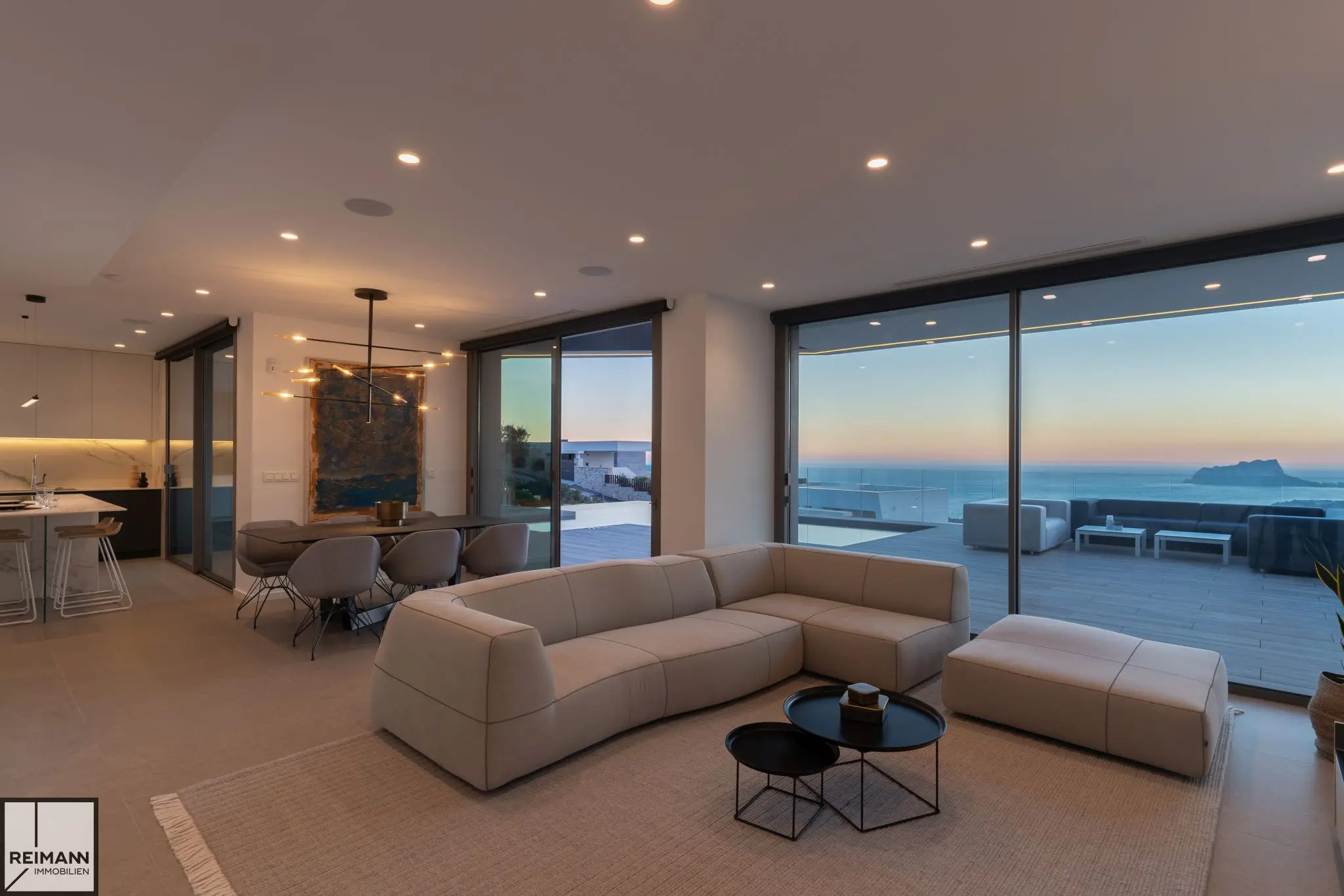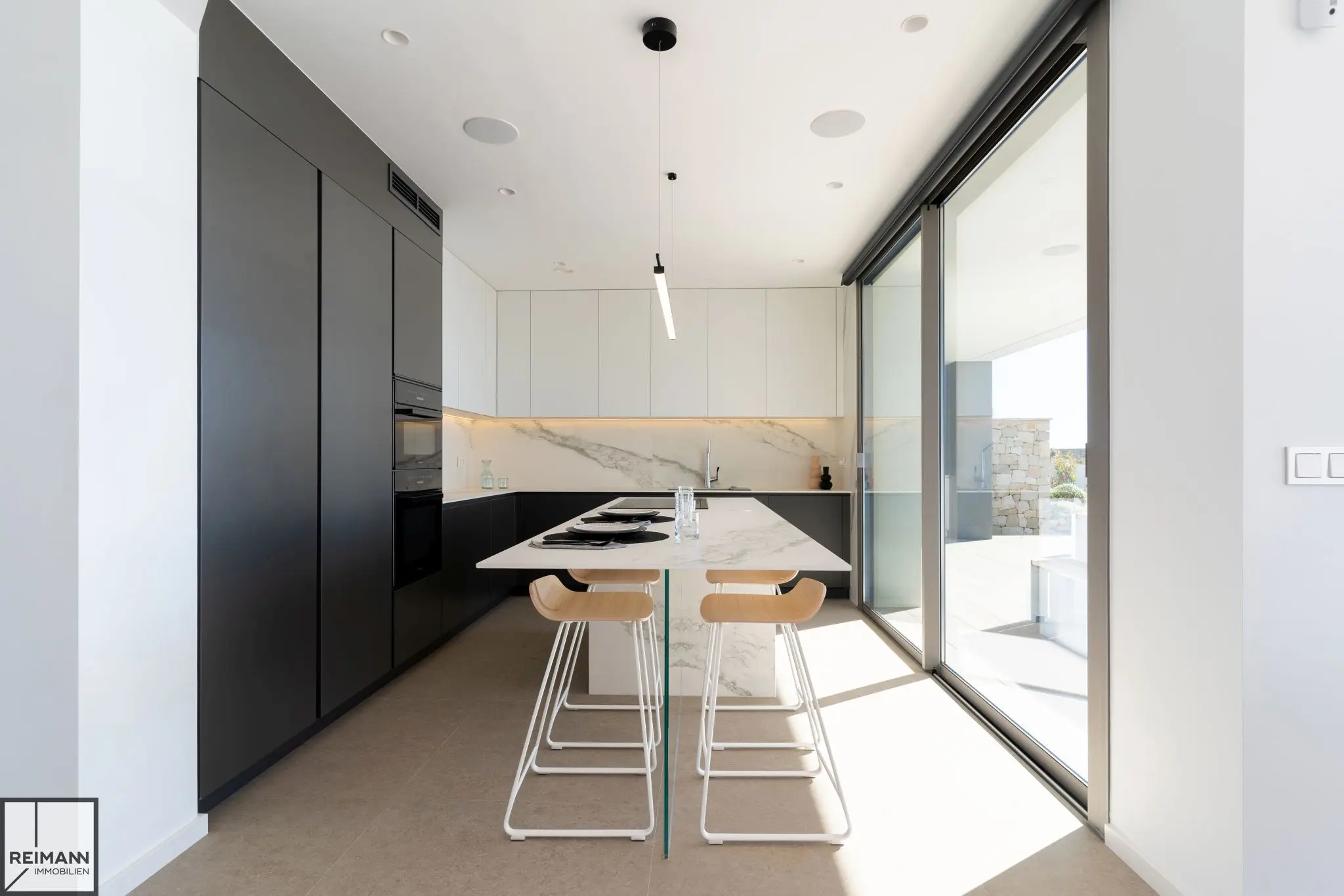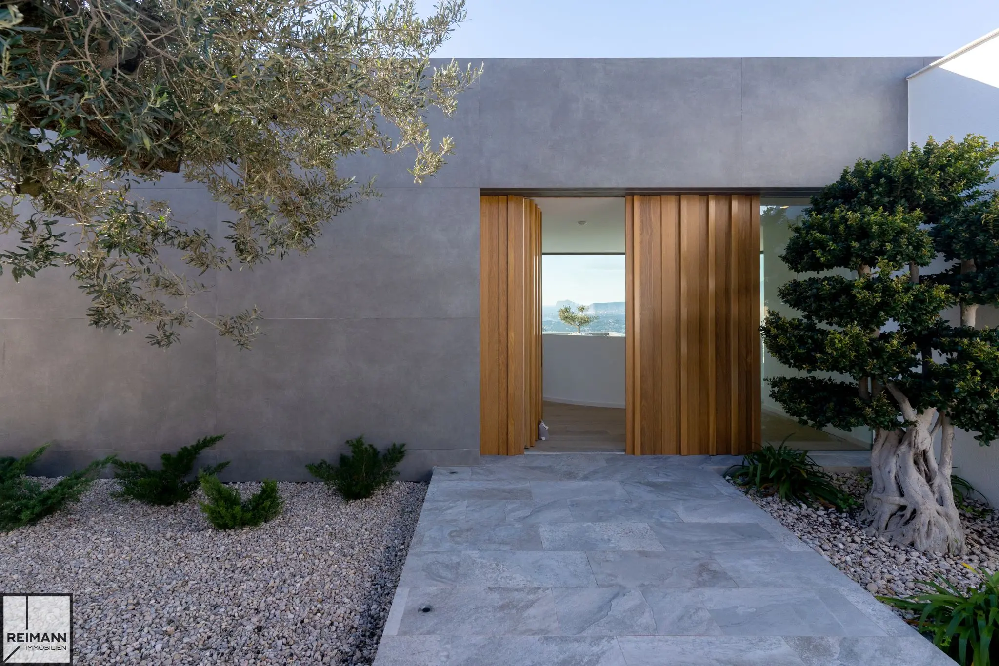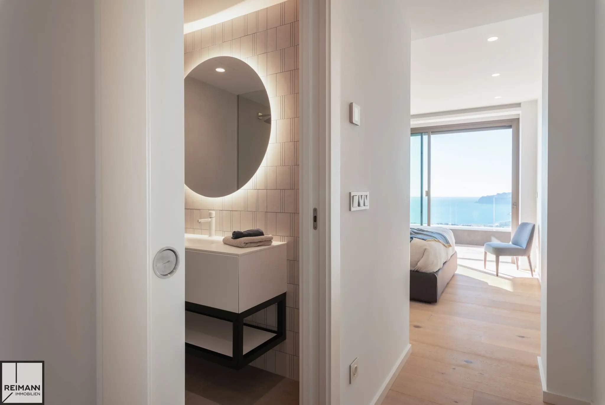 Diese luxuriöse Neubauvilla in Südwestausrichtung wurde auf einem großzügigen Grundstück von über 1.100 m² errichtet und beeindruckt durch ihre klare Architektur, lichtdurchfluteten Räume und eine unvergleichliche Aussicht auf das Mittelmeer. Es handelt sich um einen Erstbezug – die Villa ist schlüsselfertig, vollständig eingerichtet und bezugsbereit. Der offene Wohnbereich verbindet Wohnzimmer, Esszimmer und Küche nahtlos mit der weitläufigen Terrasse, sodass Innen- und Außenraum ineinander übergehen. Vier Schlafzimmer, jeweils mit eigenem Bad en suite und privater Terrasse, bieten höchsten Wohnkomfort und absolute Privatsphäre. Hochwertige Materialien, Designer-Mobiliar internationaler Marken und modernste Haustechnik sorgen für ein außergewöhnliches Wohngefühl. Der Infinitypool, die sonnige Terrasse und der mediterran angelegte Garten machen diese Immobilie zu einem Ort, an dem Luxus, Ruhe und Natur harmonisch verschmelzen. Ideal für anspruchsvolle Käufer, die das Besondere suchen.